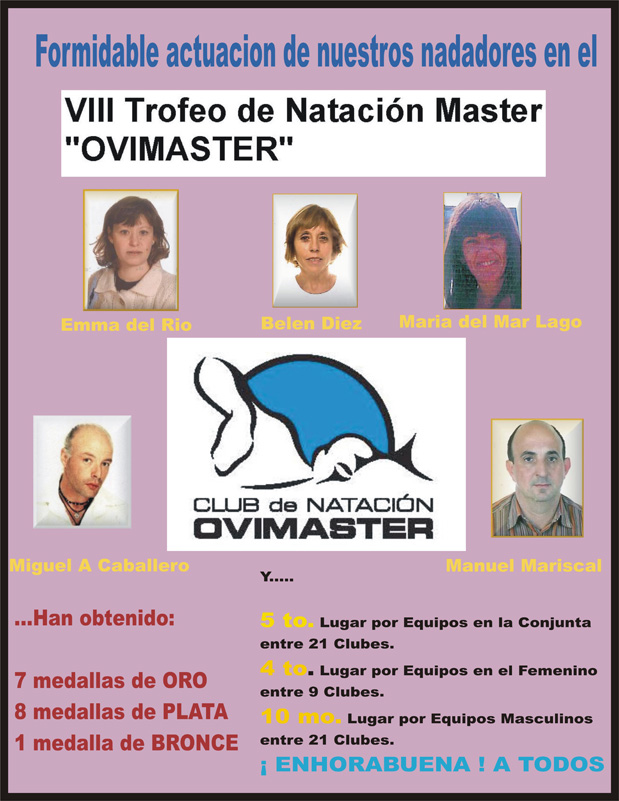 El pasado 14 y 15 de abril se disputo en Oviedo el VII Trofeo de Natación Master con una formidable actuación de nuestros nadadores. Los nadadores de nuestro club consiguieron un total de 16 medallas: 7 medallas de oro, 8 medallas de plata y 1 medalla de bronce. Consiguiendo una buenísima 5ª posición en la clasificación general de 21 clubes participantes.